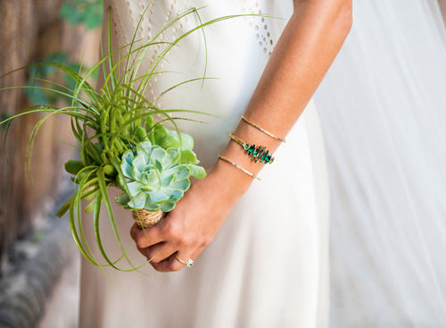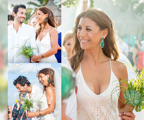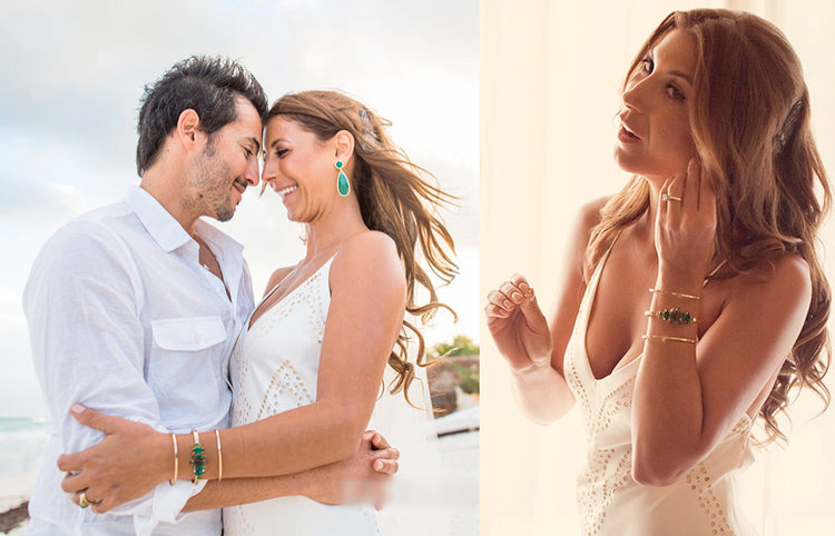 The bride wearing Susan Hanover emerald earrings and Mia cuff